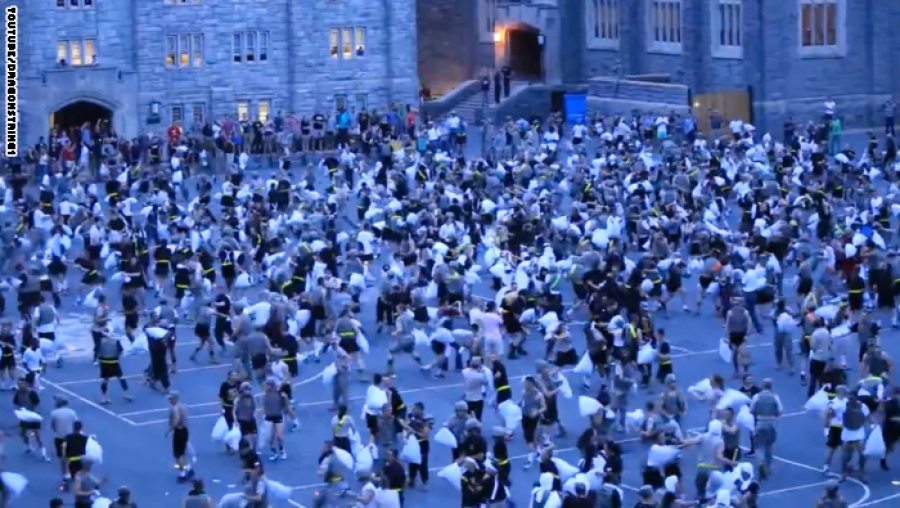 وأظهر فيديو نشر على موقع يوتيوب عدة مئات من الطلاب يتدفقون إلى الساحة لأرجحة الوسادات بطريقة غير منظمة.