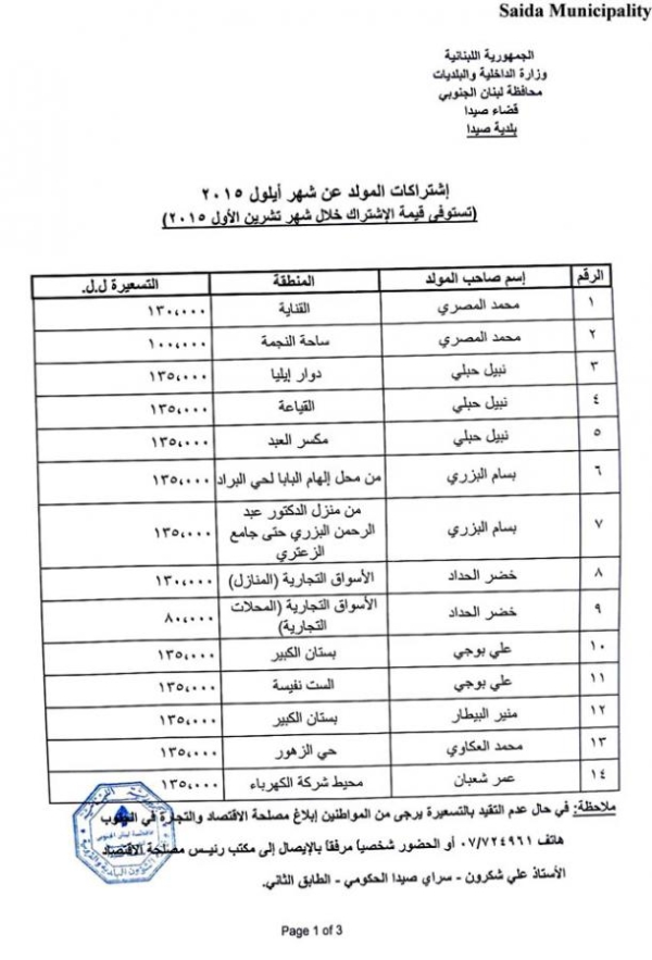 بلدية صيدا عممت جداول تكلفة إشتراكات المولدات الكهربائية عن شهر أيلول 2015 وتستوفى في تشرين الأول 2015