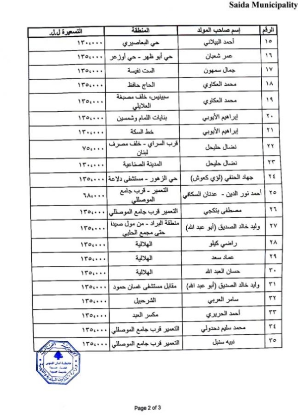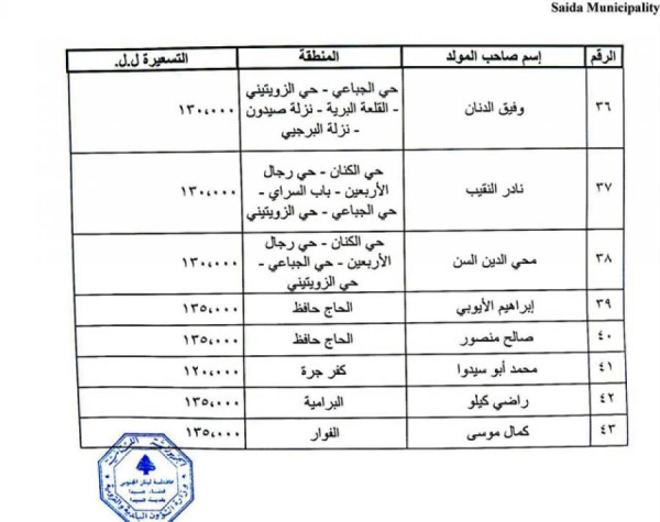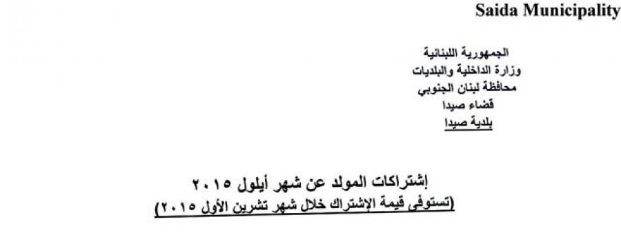عممت بلدية صيدا جداول تكلفة إشتراكات المولدات الكهربائية في منطقة صيدا عن شهر أيلول 2015 وفقا لساعات التغذية لكل مولد بمعدل 5 أمبير، بحيث تستوفى القيمة خلال شهرتشرين الأول 2015.