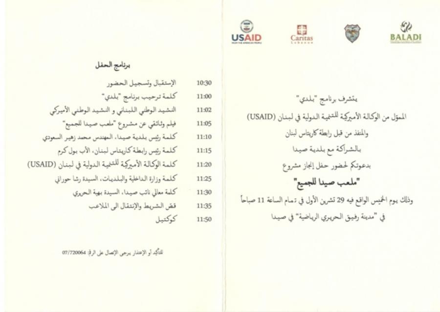 دعا برنامج " بلدي " الممول من الوكالة الأميركية للتنمية الدولية في لبنان USAID والمنفذ من قبل رابطة كاريتاس لبنان بالشراكة مع بلدية صيدا الى حضور حفل انجاز مشروع " ملعب صيدا للجميع " .