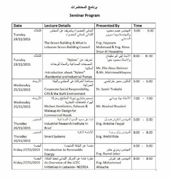 وقد خصص المعرض المهندسين والزوار بعدة محاضرات وندوات قيمة على هامش المعرض، يقدمها أساتذة وخبراء ومختصون في مجال البناء وهندسة العمارة والمباني الصديقة للبيئة، حيث لقيت المحاضرات التي عقدت خلال اليومين الماضيين اقبالا ملحوظا من الزوار، نظرا لاهمية المواضيع التي تم مناقشتها، وهذا ما تتوقعه ادارة المعرض للمحاضرات المتبقية، خاصة وان التسجيل مجاني في تلك المحاضرات، والمشاركة مفتوحة لكافة الزوار.
