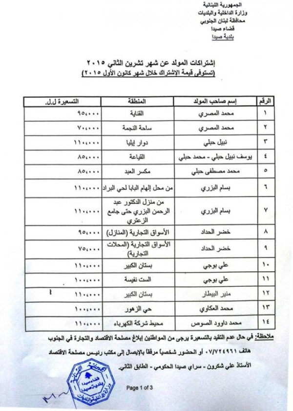 عممت بلدية صيدا جداول تكلفة إشتراكات المولدات الكهربائية في منطقة صيدا عن شهرتشرين الثاني 2015 وفقا لساعات التغذية لكل مولد بمعدل 5 أمبير ، بحيث تستوفى القيمة خلال شهركانون الأول 2015.