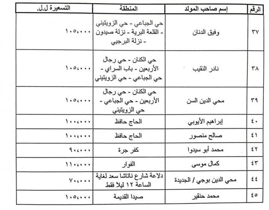 وفيما يلي الجداول بالتكلفة وأسماء أصحاب المولدات الكهربائية ومناطق التغذية: