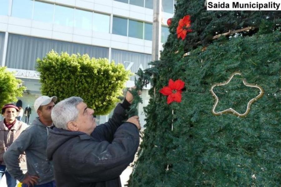 بلدية صيدا ترفع شجرة الميلاد المجيد وسط المدينة وتزينها بالورود الحمراء ومعالم الزينة الميلادية