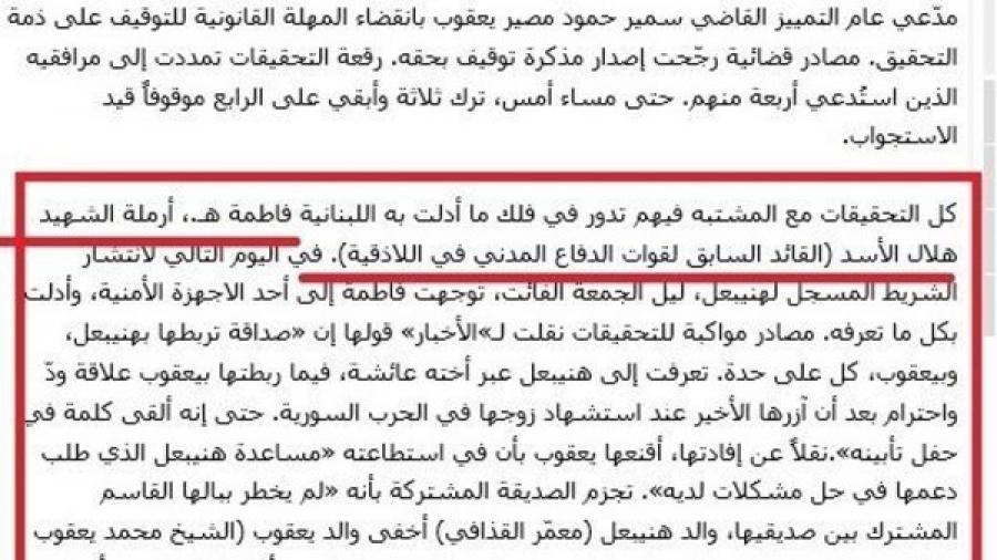 ذكرت صحيفة "الأخبار" اللبنانية التابعة لـ"حزب الله" في عددها الصادر اليوم، أن التحقيقات التي تجري مع النائب السابق حسن يعقوب "وكل المشتبه فيهم" على خلفية اختطاف نجل الرئيس الليبي السابق هنيبعل القذافي، تدور "في فلك ما أدلت به اللبنانية فاطمة. ه أرملة هلال الأسد القائد السابق لقوات الدفاع الوطني في اللاذقية". ولم تقدم الصحيفة أي معلومات إضافية عن شخصية "فاطمة" وما إذا كانت هي نفسها أم القاتل سليمان هلال الأسد الذي قتل ضابطاً تابعاً للنظام السوري في فترة سابقة.