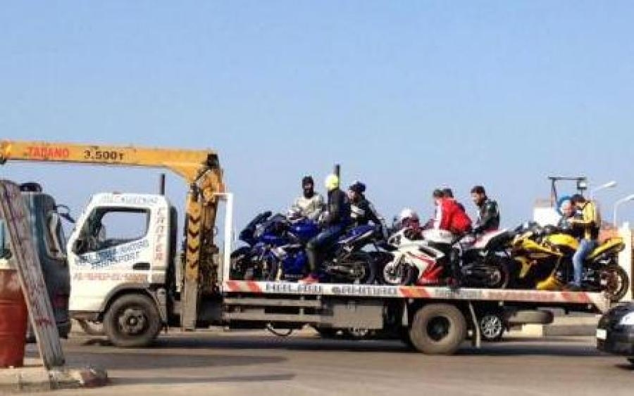 صورة اليوم مجموعة دراجات مع الدراجين على حاملة السيارات عند مدخل ميناء صيدا و ذلك للقرار الذي يمنع الدرجات النارية داخل الاراضي الصيداوية