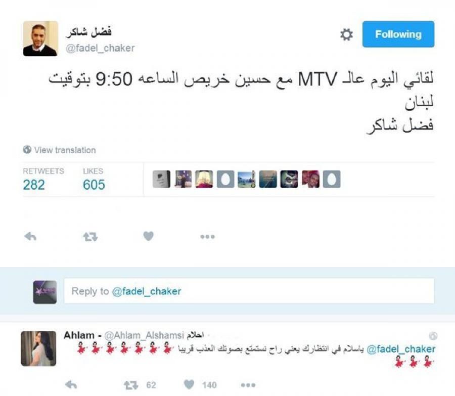 ردّت الفنانة أحلام على تغريدة فضل شاكر، الذي أعلن أنه سيطلّ عبر محطة "MTV"، وقالت: "يا سلام في إنتظارك يعني رح نستمتع بصوتك العذب قريبا".