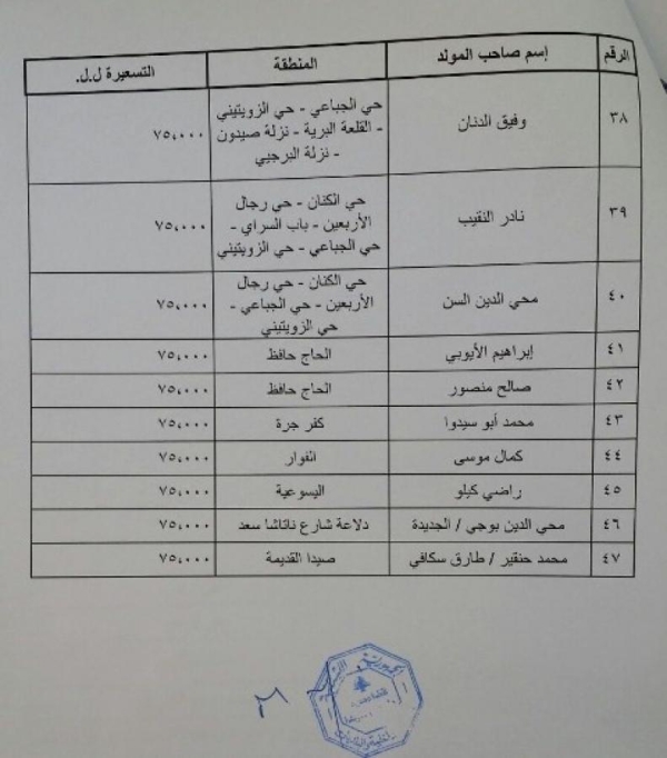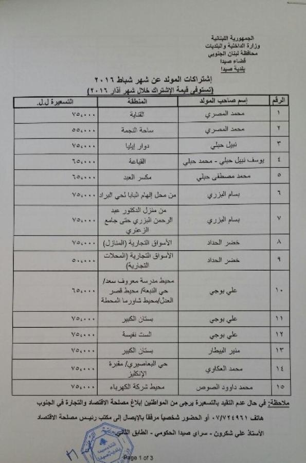 اصدرت بلدية صيدا التسعيرة الجديدة للمولدات لشهر شباط من عام 2016 تتراوح ما بين 50 الف ليرة و 75 الف ليرة للخمسة امبير. كما
