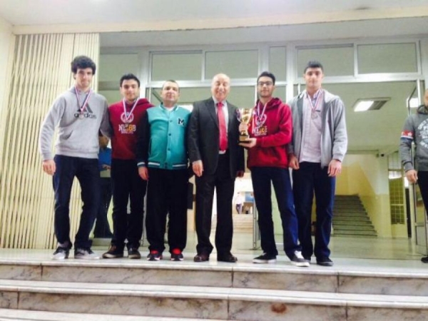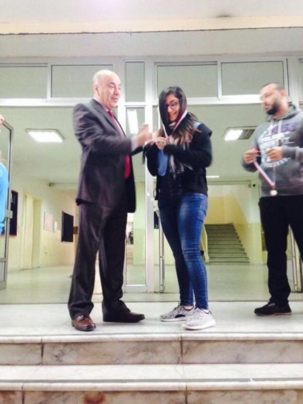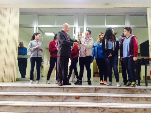 ثم قام الطلاب بتسليم الكؤوس إلى رئيس المدرسة الذي سلّم بدوره الطلاب الفائزين الميداليات.