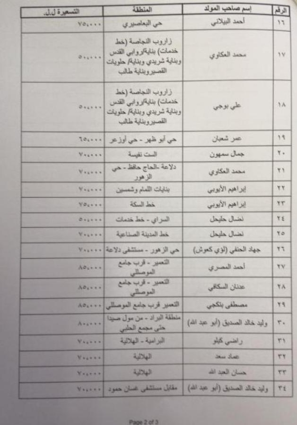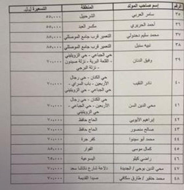 وفيما يلي الجداول بالتكلفة وأسماء أصحاب المولدات الكهربائية ومناطق التغذية: