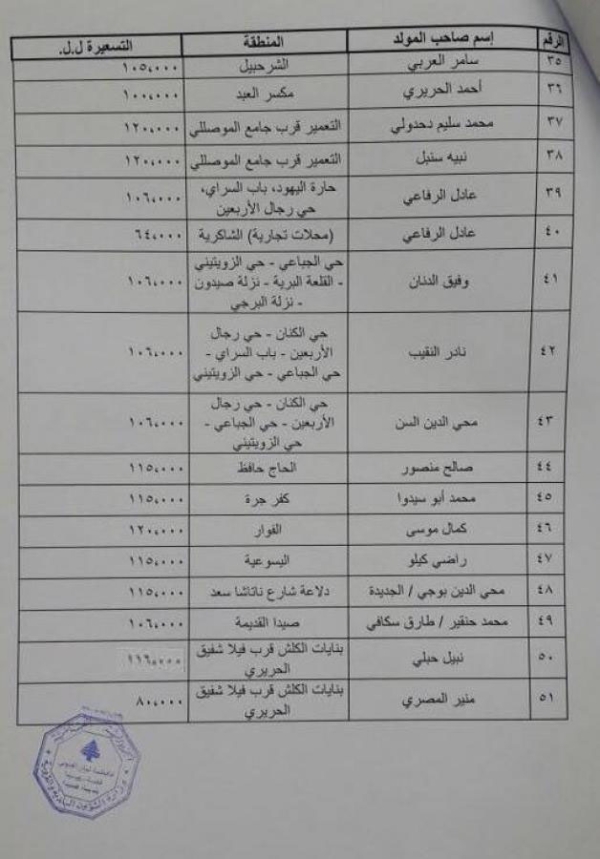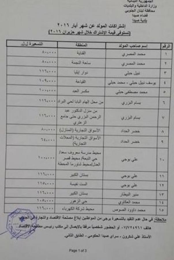عممت بلدية صيدا جداول تكلفة إشتراكات المولدات الكهربائية في منطقة صيدا عن شهر 5 2016 وفقا لساعات التغذية لكل مـــــولد بمـــــعدل 5 أمبير بحيث تستوفى القيمة خلال شهر 6 - 2016. وجددت البلدية تذكيرها للمواطنين بأنه في حال عدم التقيد بالتسعيرة إبلاغ مصلحة الإقتصاد والتجارة في الجنوب على رقم الهاتف 724961-07، أو الحضورشخصيا لرفع الأمر ، مرفقا بالإيصال، إلى مكتب رئيس مصلحة الإقتصاد الأستاذ علي شكرون في سراي صيدا الحكومي الطابق الثاني. وفيما يلي الجداول بالتكلفة وأسماء أصحاب المولدات الكهربائية ومناطق التغذية.