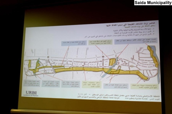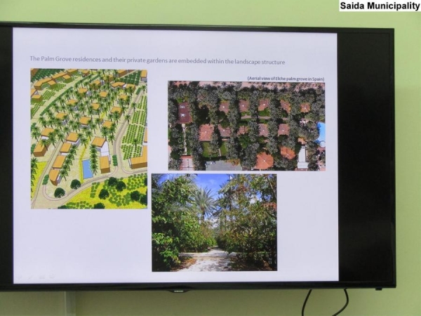 بعد ذلك شرح كل من المهندسين الدبس وفواز مشروع الضم والفرز والمخطط الجمالي للمنطقة بعد تنفيذ المشروع وهو ما سيحسن قيمة الأراضي ويعود بالنفع على المالكين وعلى صيدا ككل.