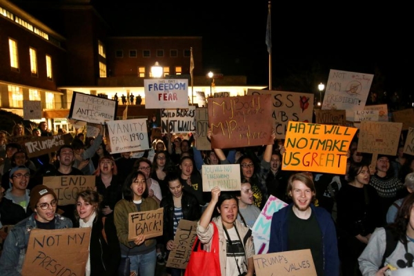 بالصور خرج الآلاف من الطلاب الجامعيين بالولايات الأمريكية، معربين عن غضبهم وحزنهم بعد فوز .