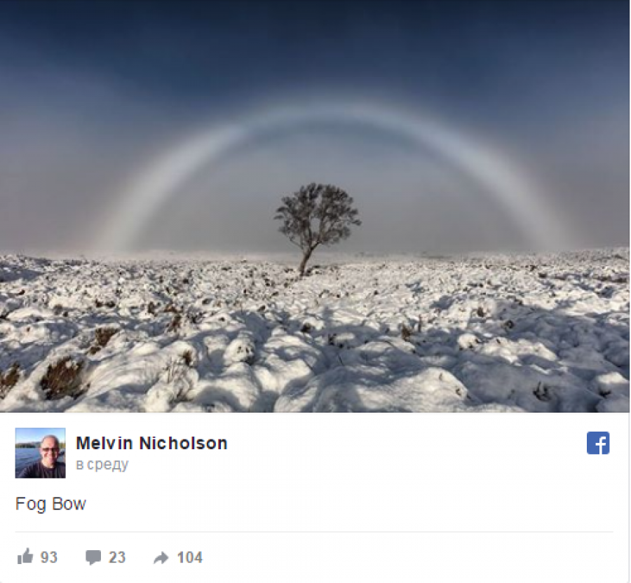 وقد نشر الصورة الرائعة على الفيسبوك شارحا هذه الظاهرة الفريدة، ويقول المصور: "قوس قزح عديم اللون يتكون من قطرات الماء الصغيرة التي تسبب الضباب، إنه لمن المدهش أن يشهد المرء هذه الظاهرة وبشكل عام لا يمكنك أن ترى القوس الا إذا كانت الشمس خلفك".