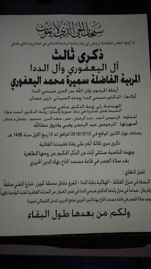 شكر وعرفان لكل من شارك في عزاء والدة القاضي زاهر حمادة