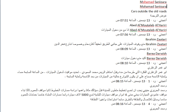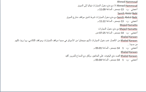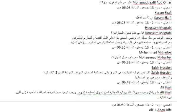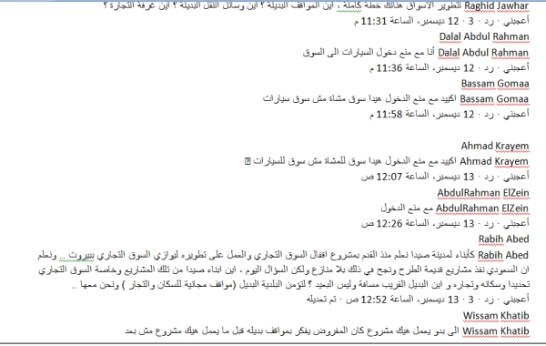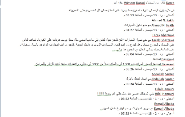 حرصًا من جريدة صيدا نت على المصداقية، وعلمًا أنّنا مع اي قرار تتخذه بلدية صيدا وجمعية التجار حول دخول السيارات إلى السوق التجاري، إلّا أننا نمارس دورنا كمراقبين فتابعنا هذه القضية من منطلق تطوير السوق التجاري لصيدا. أجرينا إستطلاع من خلال شبكة التواصل الإجتماعي فايسبوك ونترك لكم آراء المواطنين في هذا الإستطلاع. بلغ عدد المشاركين 170 شخص 90 % أجابوا نعم أي أنهم مع عدم وجود العداد و مع منع ركن السيارات بينما 2% أجابوا لا اي أنهم مع وجود العدادات ومع ركن السيارات. و8% اقترح بديلا اي مواقف عامة للسيارات ، ونترك لكم آراء الناس وتعليقاتهم. هذا الإستفتاء نتمنى على المسؤولين في المدينة أن يؤخذوه بعين الإعتبار. وإليكم نص الإستفتاء وآراء المواطنين