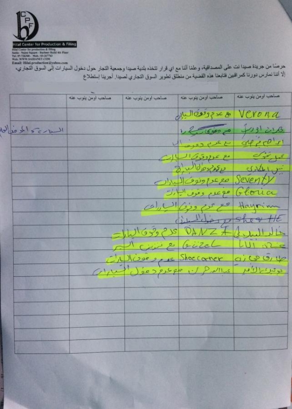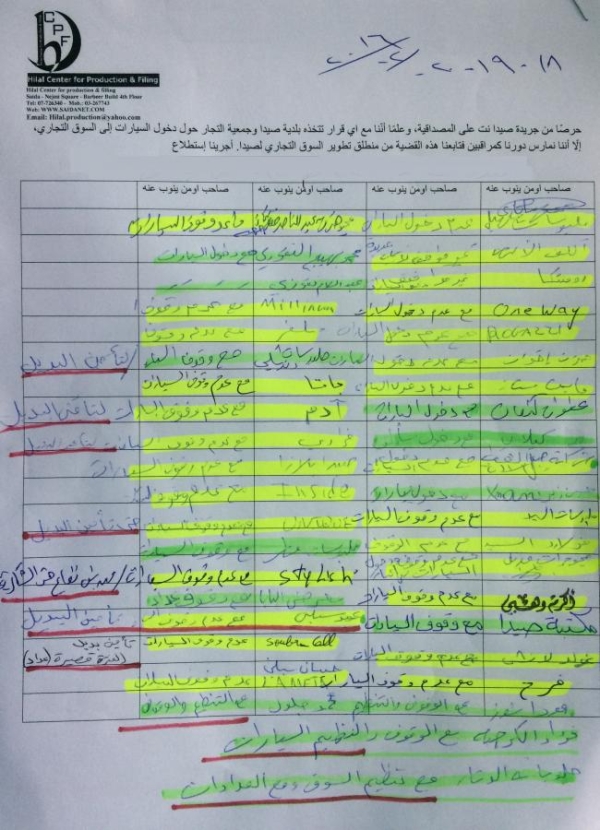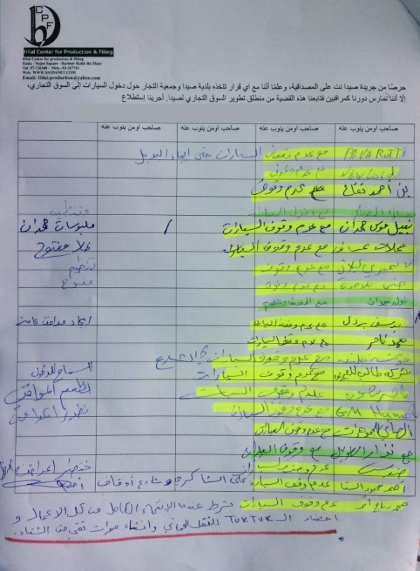 كل اسم باللون الأصفر هو رافض لوقوف السيارات وباللون الأخضر هو الذي يطالب بدخول السيارات والعدادات وباللون الأحمر مع ايجاد البديل.