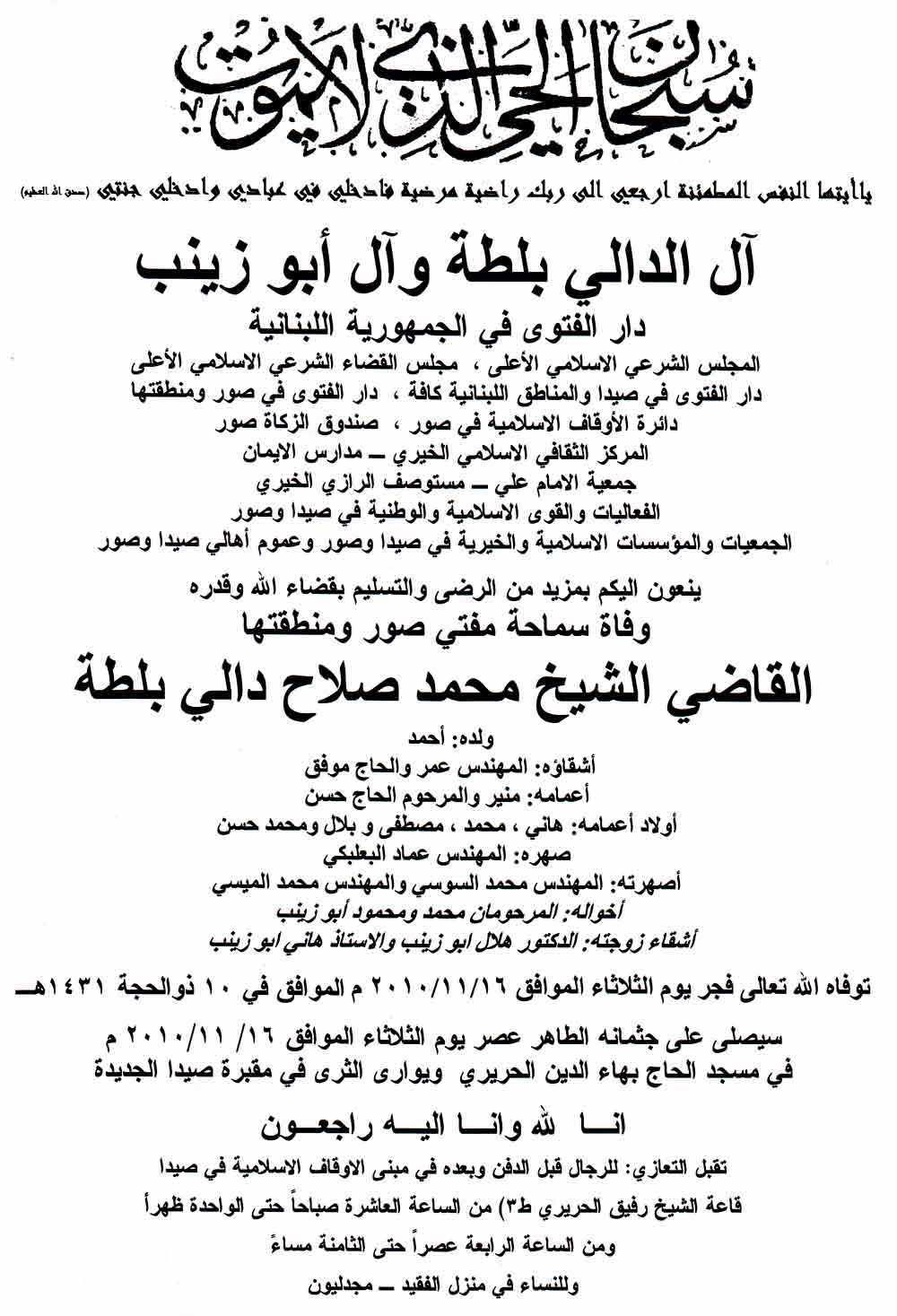 توفي مفتي صور الشيخ محمد دالي بلطه،