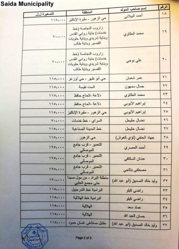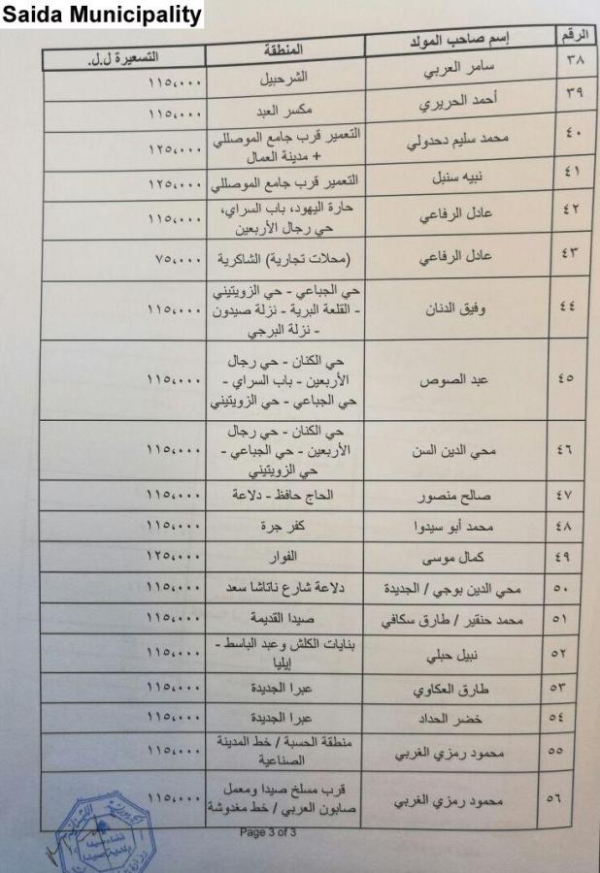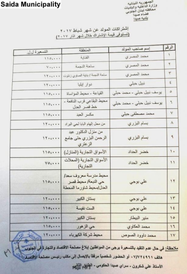 بلدية صيدا عممت جداول تكلفة إشتراكات المولدات الكهربائية عن شهر شباط 2017 وتستوفى في أذار 2017