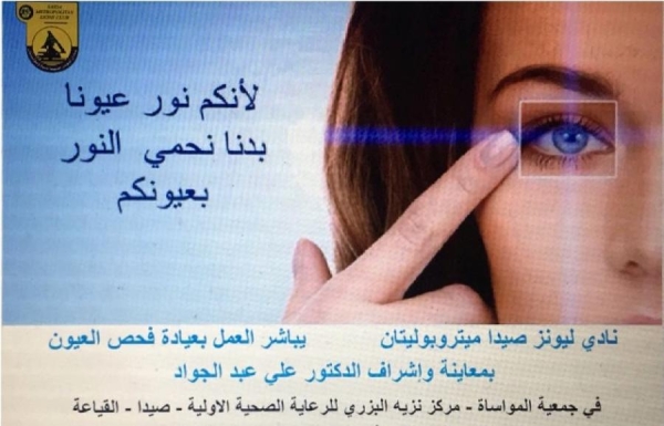تحت شعار "لأنكم نور عيوننا ..نحمي نورعيونكم " أطلق نادي ليونز صيدا متروبوليتان حملة معاينة نصف شهرية لفحص النظر للأطفال ذوي الاحتياجات الخاصة في مركز الدكتور نزيه البزري للرعاية الصحية الأولية التابع لجمعية المؤاساة والخدمات الاجتماعية وبإشراف الأخصائي الليون الدكتور علي عبد الجواد بحيث تم تحديد اوقات المعاينة مرتين في الشهر ( يومي الثلاثاء الثاني والأخير من كل شهر ).