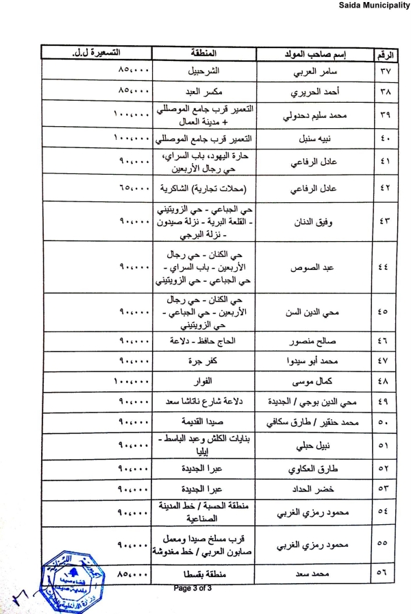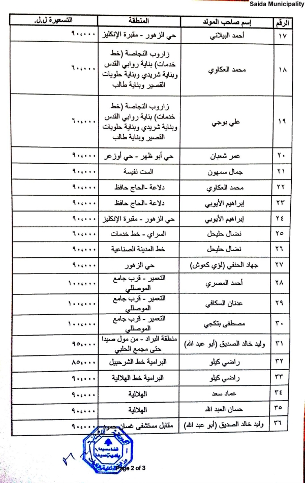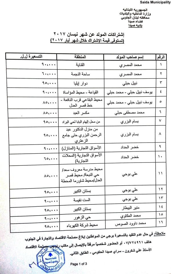 بلدية صيدا عممت جداول تكلفة إشتراكات المولدات الكهربائية عن شهر نيسان 2017 - وتستوفى في أيار 2017
