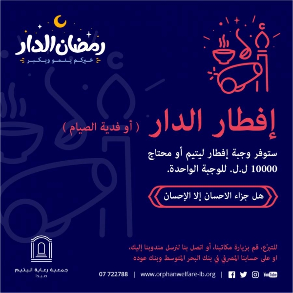 • رمضان الإحسان: إفطار الدار (أو فدية الصيام)، يمكنكم التبرع ب ١٠٠٠٠ ليرة لبنانية لتأمين كلفة وجبة إفطار يومية ليتيم أو محتاج للأسر المتعففة. كما يمكنكم إقامة الإفطار في الدار لأطفالنا الأيتام والأقل حظاً