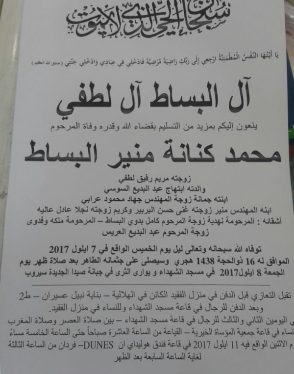 شكر وعرفان لكل من شارك في عزاء والدة القاضي زاهر حمادة
