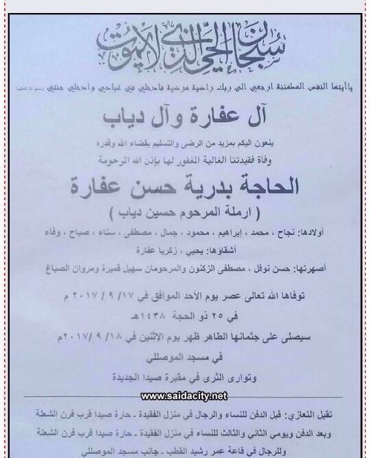 شكر وعرفان لكل من شارك في عزاء والدة القاضي زاهر حمادة
