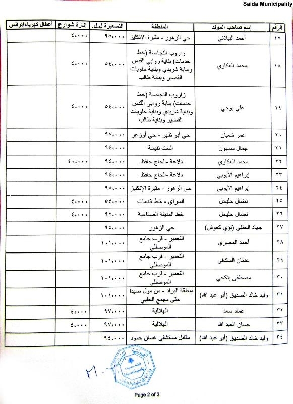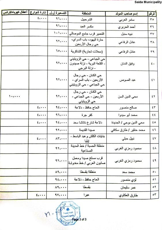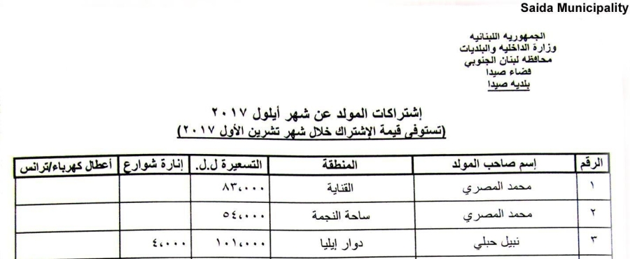 بلدية صيدا عممت جداول تسعيرة إشتراكات المولدات الكهربائية عن شهر أيلول 2017 وتتراوح بين 59 ألفا و105 آلاف ل.ل.