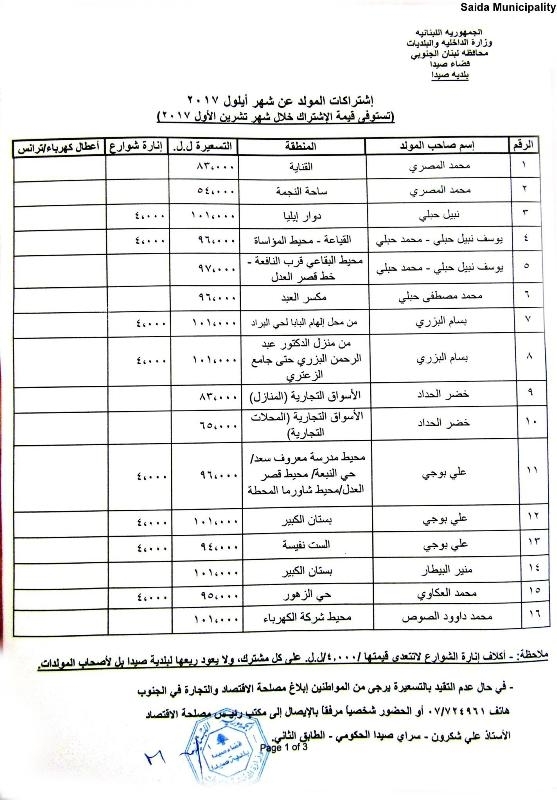 عممت بلدية صيدا جداول تكلفة إشتراكات المولدات الكهربائية في منطقة صيدا عن شهر أيلول 2017 ، وذلك بمعدل 5 أمبير للإشتراك، بحيث تستوفى القيمة خلال شهر تشرين الأول 2017، وهي تتراوح بين 59 ألفا و 105 آلاف ل.ل. .
