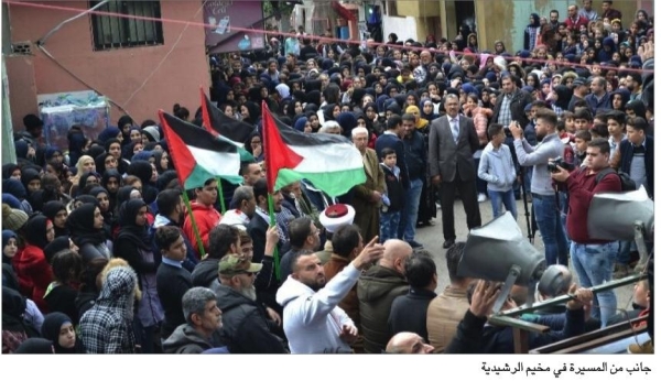 ويشهد مخيم عين الحلوة بعد صلاة الجمعة مسيرة شعبية حاشدة بدعوة من القيادة السياسية الوطنية والإسلامية في منطقة صيدا تنطلق من امام مسجد النور داخل المخيم مرورا بمساجد المخيم وصولا الى الملعب الأحمر .
