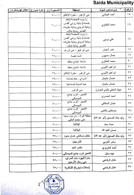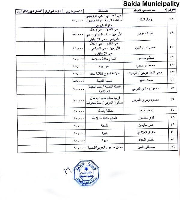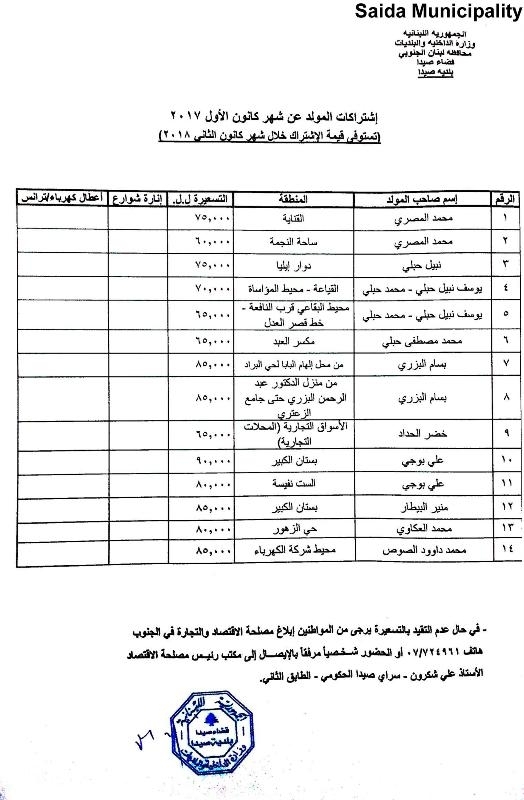 بلدية صيدا عممت جداول تسعيرة إشتراكات المولدات الكهربائية عن شهركانون الأول 2017 وتستوفى في كانون الثاني 2018 تتراوح بين 60 ألف ل.ل. و90 ألف ل.ل