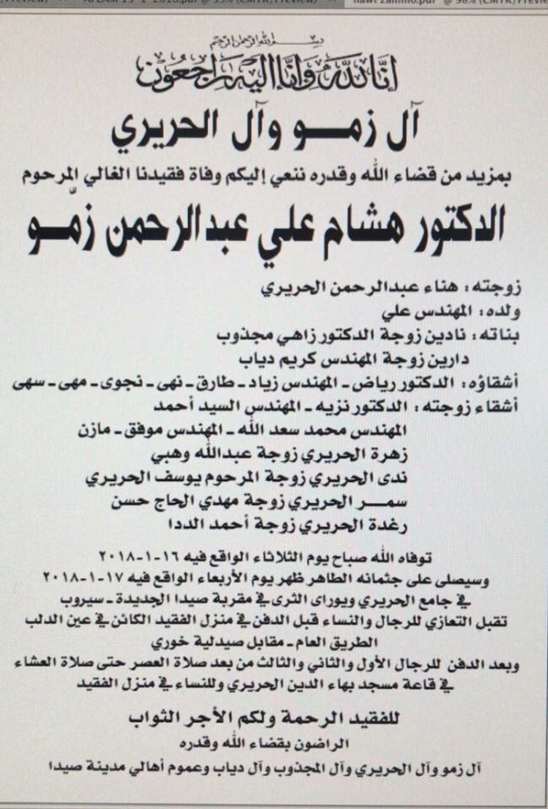 شكر وعرفان لكل من شارك في عزاء والدة القاضي زاهر حمادة