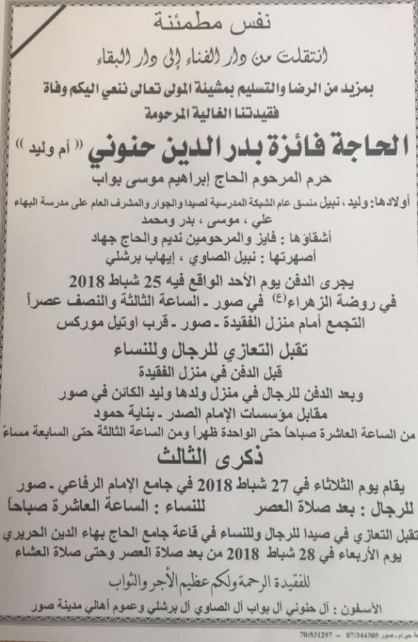 وفاة الحاجة فائزة حنوني