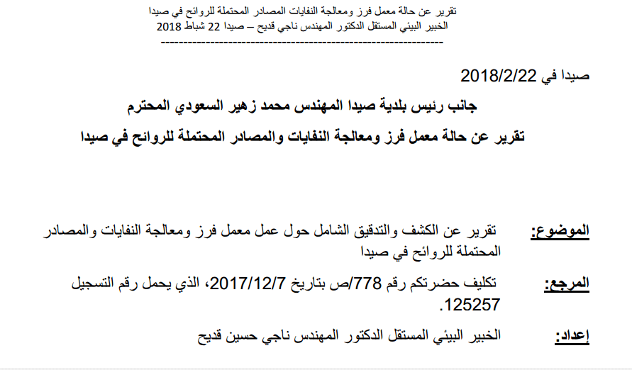 تقرير عن حالة معمل فرز ومعالجة النفايات والمصادر المحتملة للروائح في صيدا