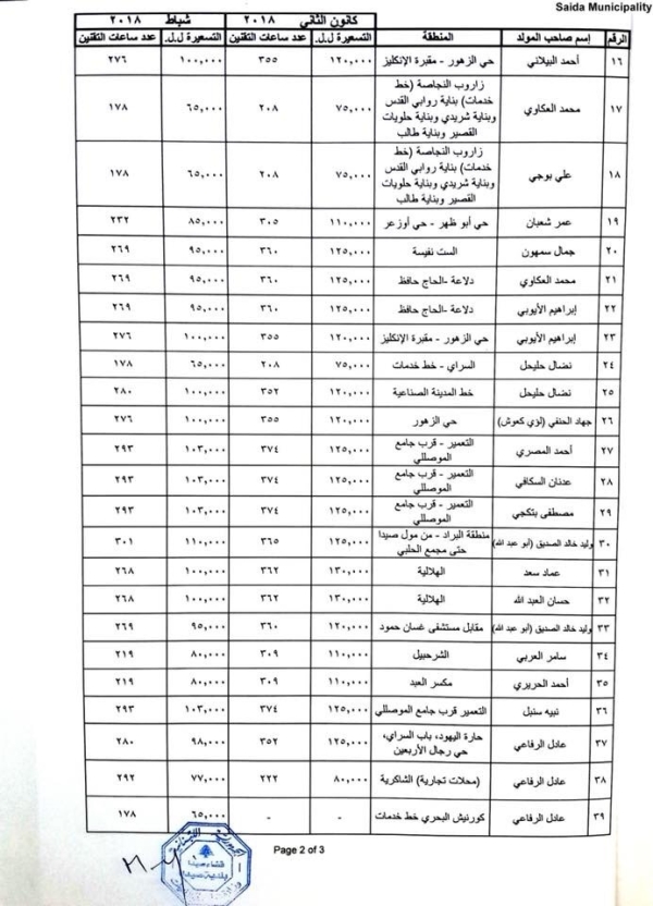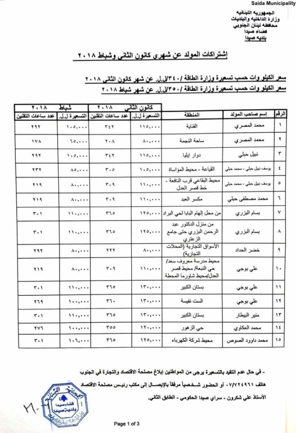 بلدية صيدا عممت جداول تسعيرة إشتراكات المولدات عن شهري ك2 وشباط 2018 لمقارنة إنخفاض تسعيرة شباط بنسبة 20-30% عن ك2 بسبب إنخفاض ساعات التقنين