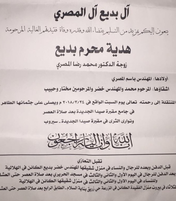 شكر وعرفان لكل من شارك في عزاء والدة القاضي زاهر حمادة