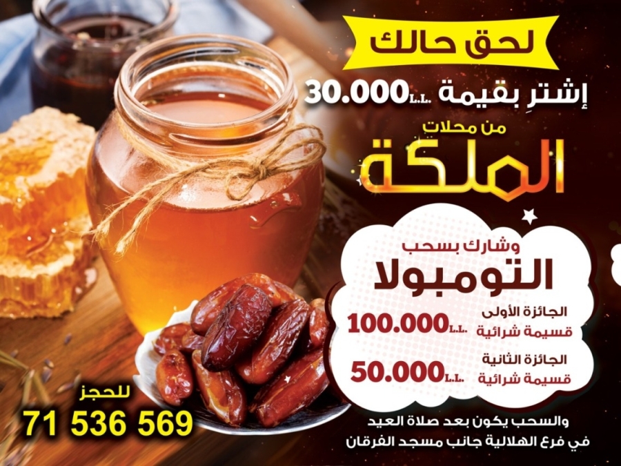 اشتر بقيمة ٣٠٠٠٠ من اي فرع من محلات الملكة وادخل في سحب التمبولا بعد صلاة العيد من فرع الملكة بجانب مسجدالفرقان