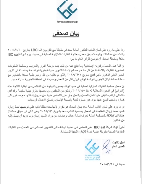 رداً على ما ورد على لسان النائب الدكتور أسامة سعد في مقابلة مع تلفزيون الـ LBCI بتاريخ 20/6/2018 والمتضمن مغالطات وإتهامات بحق معمل معالجة النفايات المنزلية الصلبة في صيدا، يهم شركة IBC sal مالكة ومشغلة المعمل أن توضح للرأي العام ما يلي:
