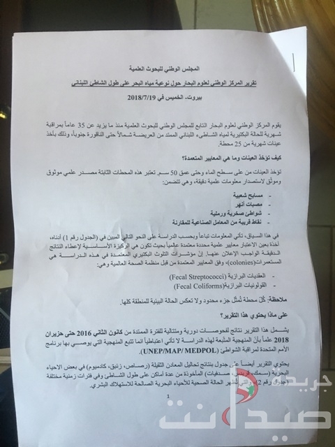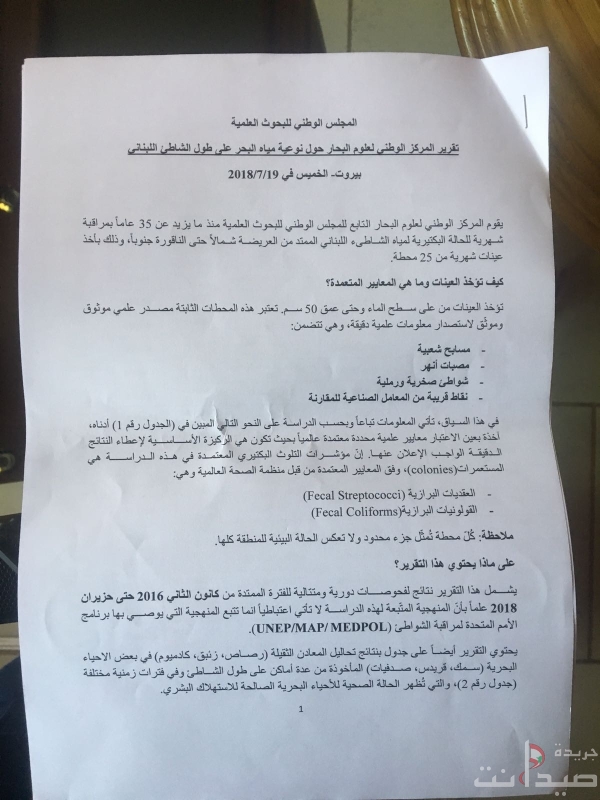المركز الوطني لعلوم البحار يصدر تقريرًا حول نوعيّة المياه في البحر اللبناني شاطئ شعبي و جزيرة صيدا تعتبر من المناطق الجيدة والآمنة للسباحة،
