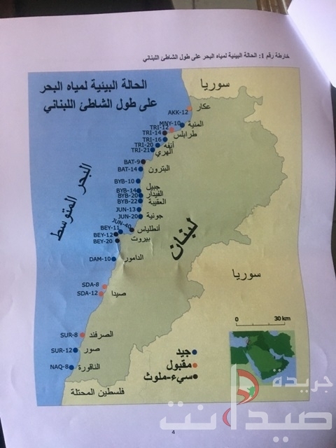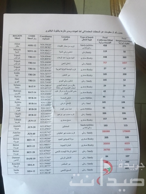 وبحسب الجداول، فالمياه التي كانت نتيجتها أنّها ملوثة هي في شاطئ شعبي في طرابلس (757 مستعمرة بكتيريا)، قرب مصبّ نهر انطلياس (285 ألف مستعمرة بكتيريا)، المنارة – الجديدة (20350 مستعمرة بكتيريا) وشاطئ الرملة البيضاء الشعبي (26750 مستعمرة بكتيريا).