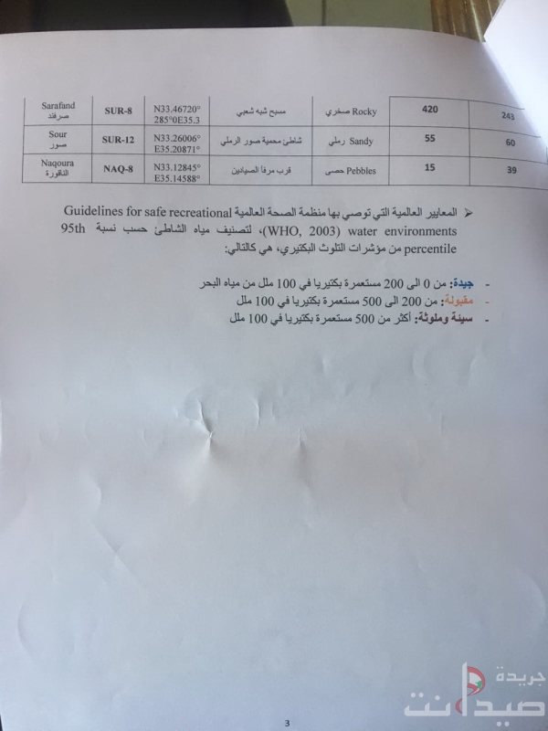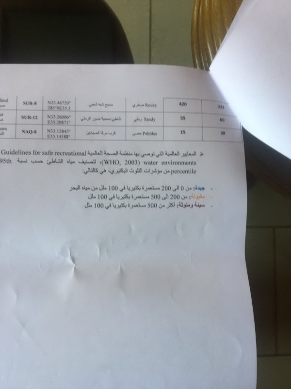 وفي الجداول المرفقة، تبدو نتائج العينات التي أخذت من المياه اللبنانية، وأوضح المركز أنّه عندما تكون النتيجة من 0 الى 200 مستعمرة بكتيريا في 100 ملل من المياه، فهذا يعني أنّ النتيجة جيدة، ومن 200 الى 500 تكون المياه مقبولة، وقد جاءت نتيجة شاطئ صيدا الشعبي (455 مستعمرة بكتيريا) وهي نتيجة مقبولة وذلك ما قامت به بلدية صيدا بتحويل المجاري إلى معمل الصرف الصحي ما يعني أنه بإمكان المواطنين النزول الى البحر لممارسة هواية السباحة كما وأن جزيرة صيدا تعتبر من المناطق الجيدة والآمنة للسباحة، أمّا إذا تعدّت ذلك وبيّنت النتيجة وجود أكثر من 500 مستعمرة بكتيريا في 100 ملل فتكون المياه سيئة وملوّثة.