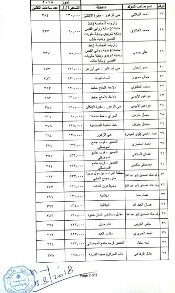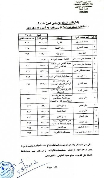 وفيما يلي الجداول بالتكلفة وأسماء أصحاب المولدات الكهربائية ومناطق التغذية والتسعيرة وعدد ساعات التقنين: