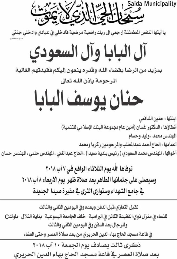 إنتقلت إلى رحمته بعد ظهر اليوم السيدة حنان يوسف البابا (إبنة شقيقة رئيس بلدية صيدا المهندس محمد السعودي – وشقيقة الدكتور غسان البابا -أمين عام مجموعة البنك الإسلامية للتنمية) حيث ستتم مراسم الصلاة على جثمانها الطاهر ظهر غد الأربعاء 8-8-2018 في مسجد الشهداء في مدينة صيدا وتوارى الثرى في مقبرة صيدا الجديدة.