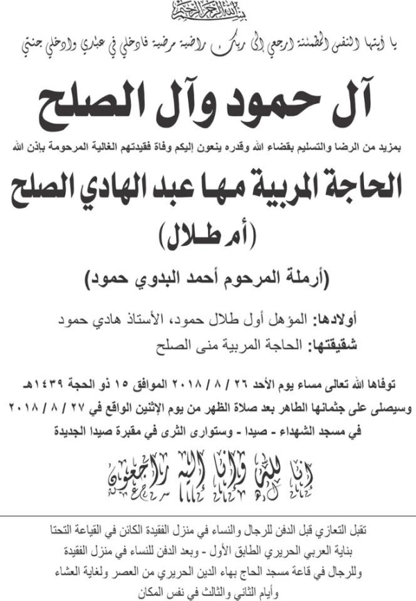 شكر وعرفان لكل من شارك في عزاء والدة القاضي زاهر حمادة
