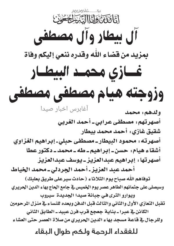 رحم الله غازي البيطار وزوجته هيام المصطفى الذين قضوا في حادث سير على طريق بعلبك وأسكنهم فسيح جناته