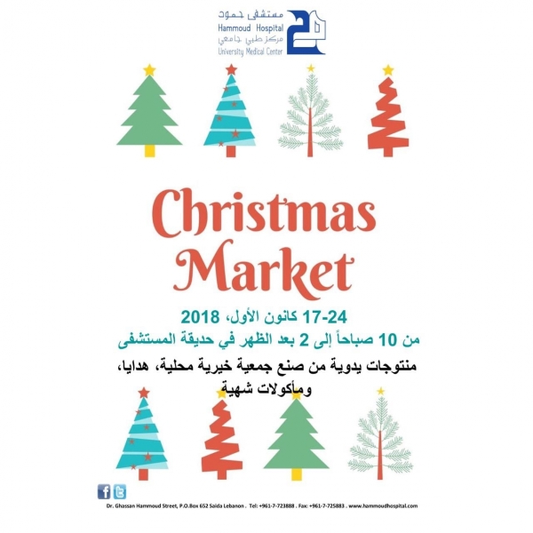 لمناسبة الأعياد المجيدة ينظم مستشفى حمود – مركز طبي جامعي سوقاً ميلادية "Christmas Market" ابتداءً من يوم الاثنين 17 كانون الأول 2018 وحتى يوم الاثنين 24 منه من الساعة العاشرة صباحا وحتى الثانية بعد الظهر في حديقة المستشفى . وتتضمن السوق الميلادية " منتجات يدوية من صنع جمعيات خيرية محلية ، وهدايا ومأكولات شهية " .