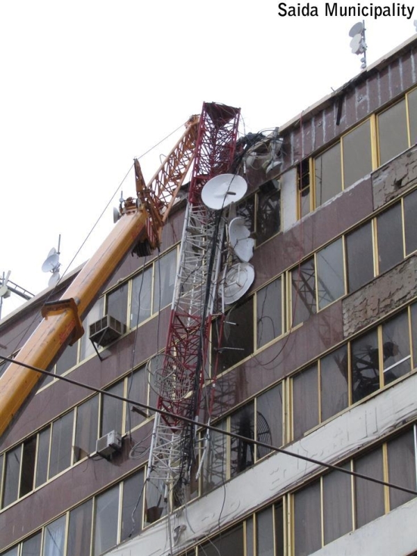 والامر الثاني الذي حصل هو سقوط عامود الإرسال في شارع فخر الدين حيث حصل الحادث بعد مغرب أمس والحمد لله لم تحصل إصابات وكان إصرارنا على أن يتم العمل ليلا لرفع العامود من على واجهة المبنى وإزالته من المكان كي تتمكن الناس من مزاولة أعمالها صباحا، وقمنا بإرسال سيارة إنارة تابعة للبلدية من أجل إضاءة المكان خلال عملية رفع العامود.