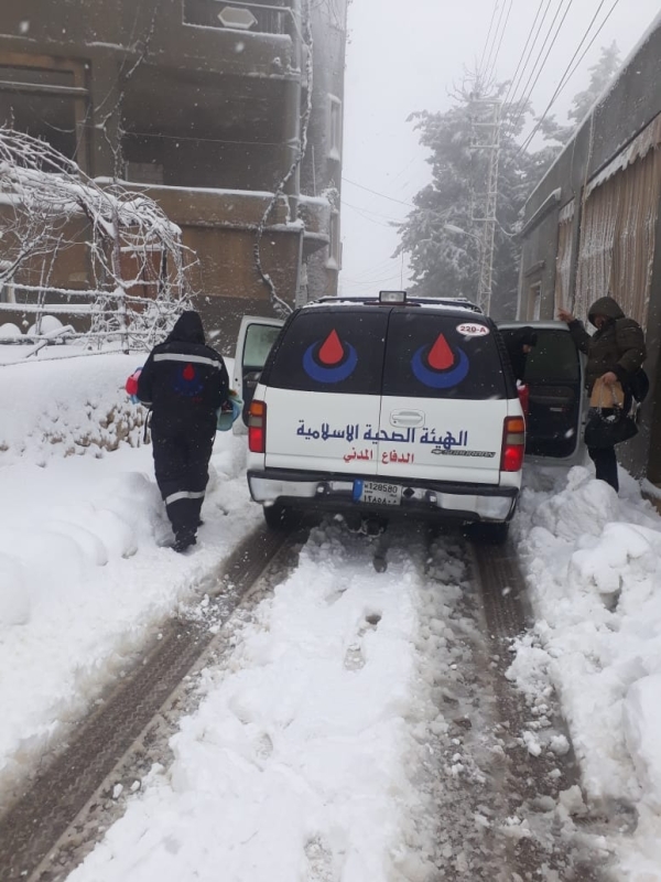 إستنفرت الهيئة الصحية الاسلامية طواقم الدفاع المدني التابعة لها ووضعتهم في خدمة المواطنين في المناطق الجبلية وقد عملت تلك الفرق على فتح تلك الطرق في منطقة إقليم التفاح بين قرى الإقليم وبينه وبين البقاع الغربي وعملت على مساعدة المواطنين العالقين والذين تعطلت مركباتهم عن العمل بسبب العاصفة والثلوج ووضعت ارقام الطوارئ في خدمة المواطنين: