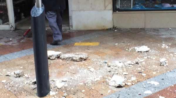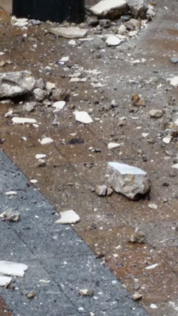كارثة نجا منها عدد من المواطنين وأصحاب المحلات في السوق التجاري بسبب سقوط حجارة من بناية البربير